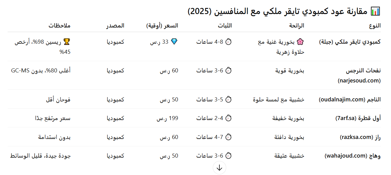 📊 مقارنة عود كمبودي تايقر ملكي مع المنافسين (2025)