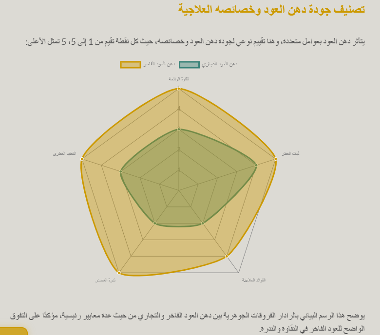 كيميائياً، يختلف دهن العود الطبيعي اختلافًا جذريًا عن الزيوت الصناعية التي تُصنع من مذيبات ومركبات عطرية تركيبية. فبينما تفقد الزيوت الصناعية عمقها وثباتها بسرعة، يظل دهن العود الطبيعي مدهش الثبات، تزداد رائحته جمالاً مع مرور الوقت بسبب تفاعل زيوته مع حرارة الجسم والجلد.