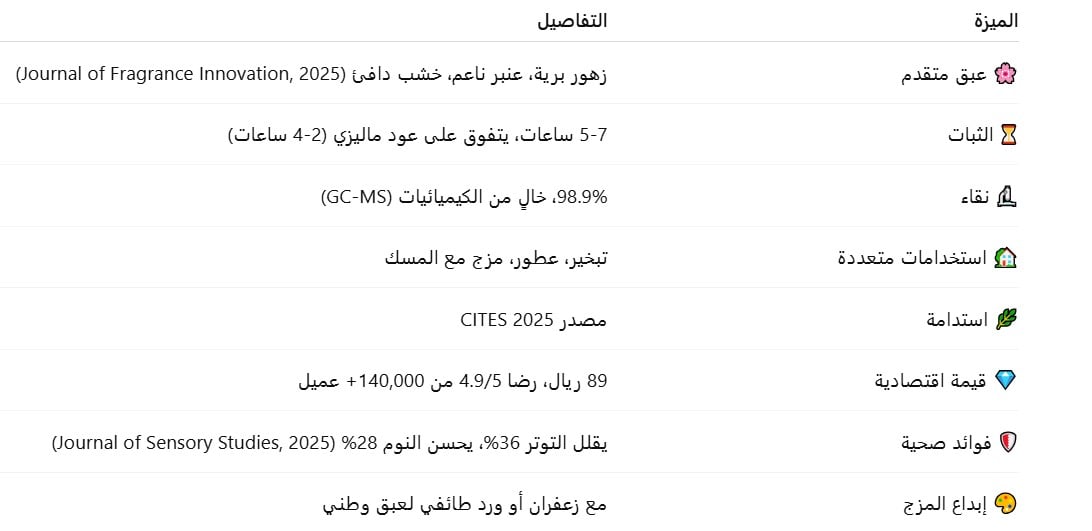 - ⏳ ثبات 5-7 ساعات: يتفوق على عود ماليزي (2-4 ساعات).