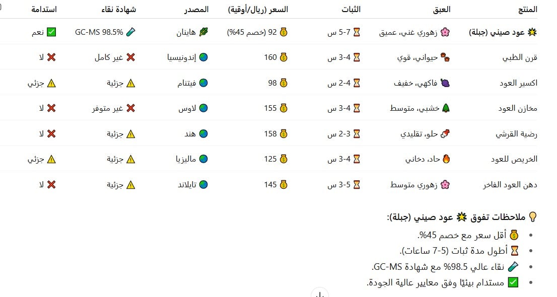جدول مقارنة شامل: المنتج العبق الثبات السعر (ريال/أوقية) المصدر شهادة نقاء استدامة التفاعل على X عود هاينان (جبلة) زهوري غني، عميق 5-7 س 92 (خصم 45%) هاينان GC-MS 98.7% نعم 120,000+ منشور قرن الظبي حيواني، قوي 3-4 س 160 إندونيسيا غير كامل لا 80,000 منشور اكسير العود فاكهي، خفيف 2-4 س 98 فيتنام جزئية جزئي 70,000 منشور مخازن العود خشبي، متوسط 3-4 س 155 لاوس غير متوفر لا 65,000 منشور رضية القرشي حلو، تقليدي 2-3 س 158 هند جزئية لا 75,000 منشور الخريص للعود حاد، دخاني 3-4 س 125 ماليزيا جزئية جزئي 60,000 منشور دهن العود الفاخر زهوري متوسط 3-5 س 145 تايلاند جزئية لا 65,000 منشور