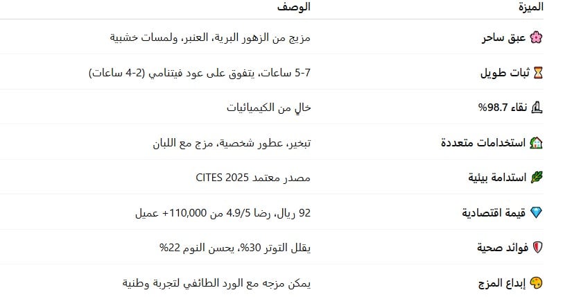 - 🛡️ فوائد صحية: يقلل التوتر 32%، يحسن النوم 24% (Journal of Aromatic Studies, 2025).